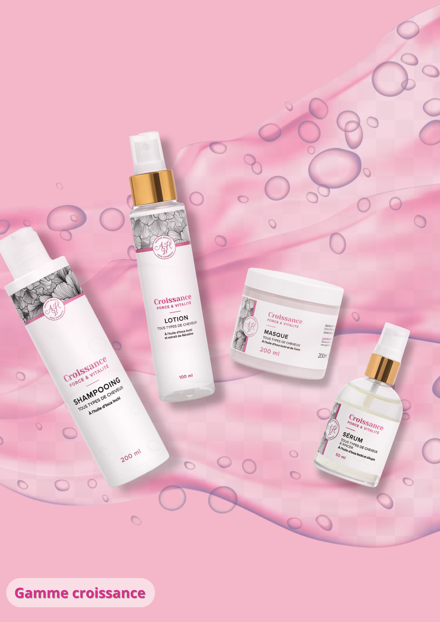 - Shampoing Croissance et masque (200 ml) : Purifie tout en stimulant les racines.